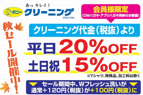 ポニークリーニングは 会員様向け 秋のセール実施中です。 ぜひ、ご利用ください。 ※詳しくは、店頭にて。 ※画像はイメージです。 <新規会員様も募集中>
