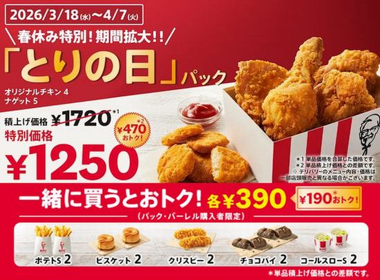 4月7日(火)までの期間 「とりの日パック」がお買得! オリジナルチキンが4ピースと、 ナゲットが5ピースのセット! ※他の割引企画との併用はできません。 ※追加でおトク(各2個390円)! 「とりの日パック」をご購入いただくと、 「ポテト(S)」2個、「ビスケット」2個、 「カーネルクリスピー」2ピース、 「チョコパイ」2個、 「コールスロー(S)」2個など それぞれ390円で、お得にお求めいただけます。 詳しくは、店舗スタッフまで。 ※商品は数量限定のため 販売を終了させていただく場合もございます。 ※画像はイメージです。