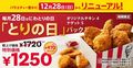 12月28日から「とりの日パック」の 内容をリニューアルいたします。 オリジナルチキンが4ピースと、 ナゲットが5ピースのセットに変更! ※他の割引企画