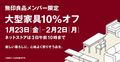 無印良品メンバーを対象に、 対象の大型家具10%オフとなるキャンペーンです。 ※収納ケースなど一部対象外商品がございます。 ※他の割引企画・キャンペーンとの