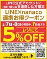 LINE公式アカウントに nanacoを連携した方限定! 3月7日(土)、8日(日)の期間中に、 1回使える 5%引クーポン!届きます。 ※一部割引対