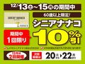 12月13日(土)から15日(月)までの 期間で開催します。 60歳以上限定・シニアナナコを レジにかざすだけ! 期間中1回限り! 税込価格から10%OFF!